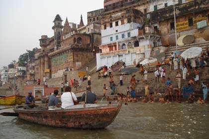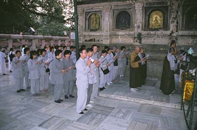 大夥五點便去坐船遊恆河看日出,河裏有人在沐浴,河邊有人在火化往生者,也有印度教的瑜珈修行者在打坐看完日出我們便到對岸請恆河沙,大家將請到的恆河沙收集在一起,由老師帶領大家作法加持。回旅館早餐後到鹿野苑參拜迎佛塔及參觀博物館,並在初轉法輪的紀念塔處繞塔及作法會。下午餐後驅車前往菩提迦耶,本想趕在八點半大覺寺關門前抵達向  世尊請安,但中途因爆胎耽擱了一些時間而未能趕上,只好隔天一早五點到大覺寺作法會,繞塔及參觀八景點。在作法會時,心中又開始激動不已,眼淚亦是不自主的流了滿面。