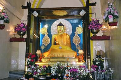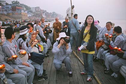 這次的印度朝聖之旅共十六天要參訪十一個地方,行程相當緊湊。第一天到達瓦拉納西,用完晚膳,老師和印度導遊孔德拉博士便帶全團36個人浩浩蕩蕩的去逛夜市。我們先乘坐遊覽車到一個定點,再改坐人力三輪車,兩個人乘坐一輛,共十八輛。到了夜市附近再走路進去,裏面人山人海,大家摩肩接踵的向前走,路兩邊是各式各樣的商店,和士林夜市很像。本來要去參觀位於夜市內供奉印度教濕婆神的黃金廟,但因人太多且限制很多便作罷。在夜市裏面來回走了應該有一個多鐘頭吧?我的背部竟然沒事!回到旅館已十點多,我匆匆漱洗完畢便去見周公了...。一夜無夢,第二天睡醒起來到浴室,一看手錶,才兩點左右!離四點半的morning call還有兩個多鐘頭,但我已睡飽,便照慣例,先作早課默讀楞嚴咒等,再修心中心法懺悔印直到聽見 morning call 再下座。室友阿滿師姊睡醒以後也很貼心的用陳皮煮了一壺熱茶讓我帶在路上喝。在此要特別一提的是:阿滿師姊是莊師兄特別為我爭取到的室友,因她年輕力壯且修得很好,感恩她一路上對我的照應。