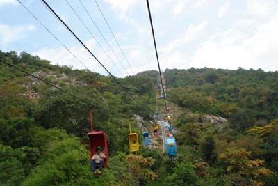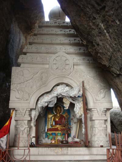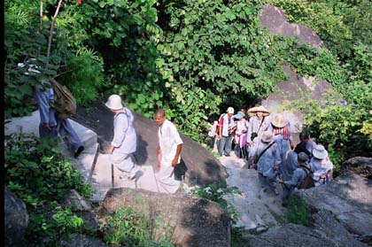 隔天要去爬雞足山朝拜大迦葉尊者,四點 morning call,我仍自動在一點半左右醒來作早課及修心中心懺悔印。四點半早餐,五點全團分乘六部吉普車出發前往足山。沿途道路凹凸不平,大家在車內被上下左右的搖來晃去,顛簸了兩個多鐘頭終於到達山下,接著便走一段平地再爬山,感恩榮師姊幫我背背包,讓我可以無負擔的爬山。十月天的印度仍很熱,大家頂著大太陽往上爬,個個汗流浹背,山路崎嶇不平,所幸需用四肢爬的幾段路已築了臺階。我手持枴杖心裏默念心中心咒,一步一步用三定點穩了再移動的方法,平穩的往上爬,途中偶而停下來擦擦汗,喝口水及向路邊的草叢施點肥。爬到半途聽說有人昏倒了,後來又傳來消息說有老師處理,我們便放心的繼續往前走,終於抵達「一線天」,高聳的兩壁之間只容得下一人側著過去,再上去便豁然開朗,出現一個大石洞,而大迦葉尊者的神像便端坐在洞中的佛龕中。等所有人都到齊了,大家便到山頂在興建大塔的地方作法會及午餐。飯後休息一會再往回走,下山途中遇到幾位頭頂建塔材料及水的印度婦女和工人,他()們無需枴杖還頭頂重物爬山,仍健步如履平地,讓我們佩服不已。下了山再度乘吉普車顛簸了兩個多鐘頭回到旅館。我終於成功的登上了雞足山!而且背不痛,腳不酸,一整天下來,精神還很好,真是跌破了不少人的眼鏡,太不可思議了!老師感慨的說:「每次都是這個樣子,幾個需要耽心的到時都沒事,反而是不用耽心的出問題!」我想:可能是幾個需要耽心的,老師有特別加持,所以才沒問題吧?!