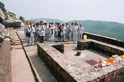 回到旅館,check out後先到大覺寺參加為 世尊供養三衣的儀式,並向 世尊告假後驅車前往靈鷲山。因通往靈鷲山的近橋被大水沖斷了,原本兩個半鐘頭的車程因繞道巴特那而行,共花了七個多鐘頭才到達旅館。隔天一早五點便坐車去參拜七葉窟,在那裏作法會及靜坐,我沒什麼感應。下午前往靈鷲山,先是搭纜車到山上的日本廟,再走下坡到當初佛陀講《法華經》的說法臺,一走上說法臺,我的內心又開始激動了,尤其是在作法會時,內心更是激動得厲害,我只能低頭掩面而泣。世尊是否也在為末法眾生難渡而憂心呢?隨後我們去參訪了以前被誤為七葉窟的藏寶窟,竹林精舍,和那爛陀大學。