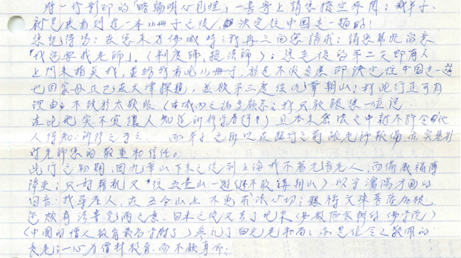 “將一份影印的《略論明心見性》寄上給您撥空參閱,我弟子就是在見到這一本小冊子後決定往中國走一趟的。您記得嗎?在您來萬佛城時,我再三向您請求:請您幫忙留意:「我還要找老師」,(剃度師或授法師)。您走後的第二天即有人上門來指點我,並給我看此小冊子,於是不假考慮即決定往中國走一趟,也因家母已正去天津探親,並欲第三次往九華山朝山,…。”