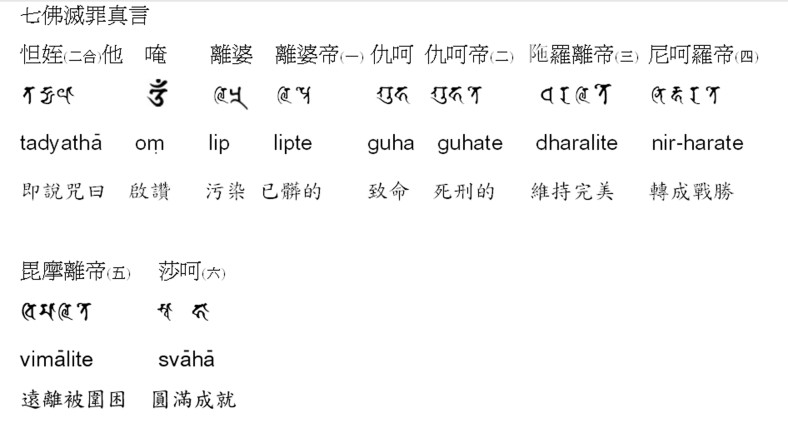 先說「半行半坐三昧」,有時候經行,有時候就禪坐,思惟這種修行入定法門,依據《大方等陀羅尼經》的記載或者依《法華經》這兩部經來修之三昧,有時候要走、有時候要坐,這部經裡面有一個咒,是大家常常在唸的滅罪真言,這就是去業障的咒,叫七佛滅罪真言:
