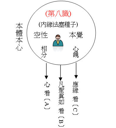 (2)真心--即自性清淨心看(註一) 。是空是覺,是我們的「覺知」看(註二) ,覺知也是心的作用。若無此覺即入真正寂靜境界。真心之二種層次:一為只到依他起自性。 二為圓成實性時為真心所現。