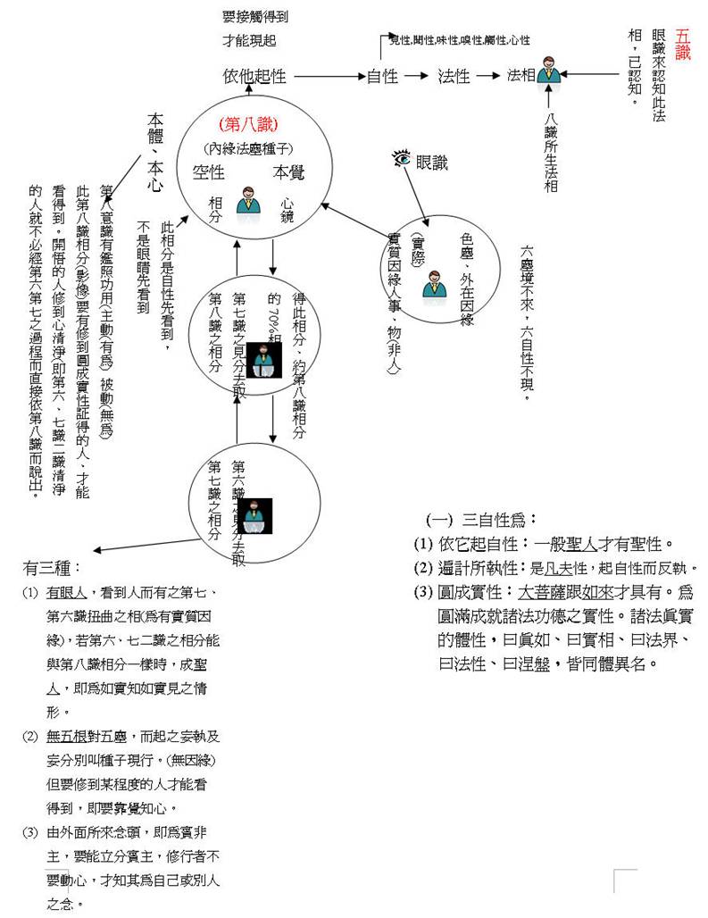 (1) 遍計所執性(是凡夫性 ) --若依他起自性後,不能僅止於此認知之第一念而己,又加以妄分別時,經第七、第六兩識而生第二念,第三念,第四念…. 等,即為遍計所執性。第六意識之分別未加入作用即遍計所執性就沒事了。