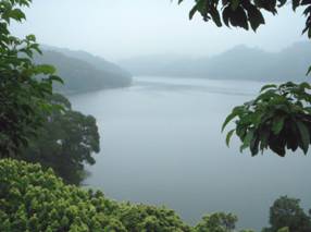 邊閒談邊行步,穿過柵門來到法會預定地,定睛一看,樹影婆娑、山青水藍令人驚艷!正如蓬門佳麗,縱使荊釵布裙、不染脂粉,也不損其明眸皓齒的清秀韻致。趕緊按下快門,細雨迷濛之中,此地別有一番清潤曼妙的丰姿。我們整體評估,看到此處空地平坦,視野絕佳,前後兩排樹木高茂,足可遮日蔽雨,且下有石桌、石椅供人憑憩,這環境確實適合大群人馬做法會,無論要集中或要散開、要站立乃至要放物,都沒問題;美中不足之處是化妝室之位置較遠。遠方尚有大路通抵潭水對岸,可惜時間不夠,只能匆匆來去,要往下一個地點挺進囉。