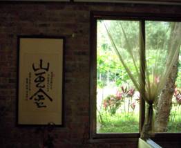 下山回到山瓦舍,聆聽雨珠敲打瓦簷的滴答節奏,阿蝶繃緊的心逐漸舒展、放平,開始昏昏欲睡。本沒啥胃口的,待熱湯上桌、下肚了,胃也就甦醒啦。陸續主菜也來囉,依序為 Jiny的主廚藝大利麵,Carrie的塔香藝大利麵,A-ma的五福松子炒飯,Helen的韓式泡菜燴飯,A-de的菌菇燴飯。色彩鮮豔、口感札實、香氣誘人。每人所點的都不同,可以相互分享品嚐。還有飯後水果與飲品,超飽足的。(感謝這頓飯由Helen師姐請客!也謝謝老闆以半價優惠!)餐後的大事,就是由當家A-ma師姐與活動組Jiny師姐,代表法爾禪修中心,正式簽訂用餐之約,繳納訂金。完成締盟儀式後,黃老闆力邀我們去參觀他所經營的另一處所,地近峨眉湖。看時間尚有餘裕,全數贊成。只是,老街之旅就只好跳過嚕。