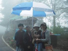 不會吧?真要去向天湖?那地方,昔日去過,感覺頗「毛」……;現在,光是想到它的背景、唸出它的名字,就令吾起雞皮疙瘩了,更遑論親身前往!(之前某晚解深密經上課前,Jiny師姐正安排行程,提到可以去這個地方,阿蝶就抖了一下,試圖舉反對票。這件事還被她小小嘲笑一番咧。)眼看同行夥伴興致勃勃,這下子阿蝶只好捨命陪君子,並且安慰自己:「甭想太多!」但這已寫下「心敏感、不清淨、沒脫黏」之伏筆囉。好巧不巧,上山時(向天湖約海拔七百多公尺),已經開始起霧,視線不良,能見度僅止於前車之尾燈;還要不停跟對向之大遊覽車會車,整排車常堵在一塊兒,進退維谷。左側是山壁、右側是懸崖,路又彎曲陡峭,讓人心臟不停噗噗跳,隨時為路況與車況捏把冷汗。