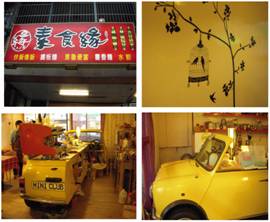 緊接著來到彌勒內院,因為尚在施工,所以僅繞行周圍一圈,拍個大佛像的照片來充數。正在此地盤桓時,我們又遇到下班的黃老闆,他說要趕回頭份,至妻子所開的店幫忙,還熱情邀約我們同行。我們五人互望一眼,便很有默契點頭應允,於是,又歷經不少七拐八彎,(至此阿蝶已經完全不認得路了,因為早就超出行前所做功課之外啦),總算來到頭份的市區大馬路上。停好車一扭頭,便看見紅底黑字的醒目招牌──素食緣。入內第一眼,便看到可愛的骨董車,被組裝成餐務檯;牆上還有黑色的圖飾,一樹一籠多鳥,饒富童趣。看得出來是很溫馨的小店。素食緣店內的飲食可分為七大項:「小炒系列、精緻套餐、焗烤、炒飯麵食、熱湯、點心小吃、咖啡飲料」,皆具特色。
