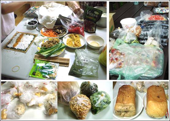 為應付大票人們的吃食,前一天義工們準備了超豐盛的餐點,包括自烤土司(兩種口味)、台式小菜(醃小黃瓜、炒腰果、滷海帶)、菜脯五穀米飯糰、辮子起司、素伍仁大餅、稻禾芝麻壽司、海苔壽司(內包──小黃瓜、黃蘿蔔乾、紅豆枝、胡蘿蔔、素鬆、乾香菇、瓠仔乾、海苔粉、青梅子粉),據說還有好些祕密武器,當天才會現身。哈,這陣仗倒像是揪團去野餐而非禪修?滿桌的食物,是否喚醒你我對童稚時光「春季遠足」的回憶呢?