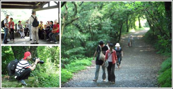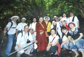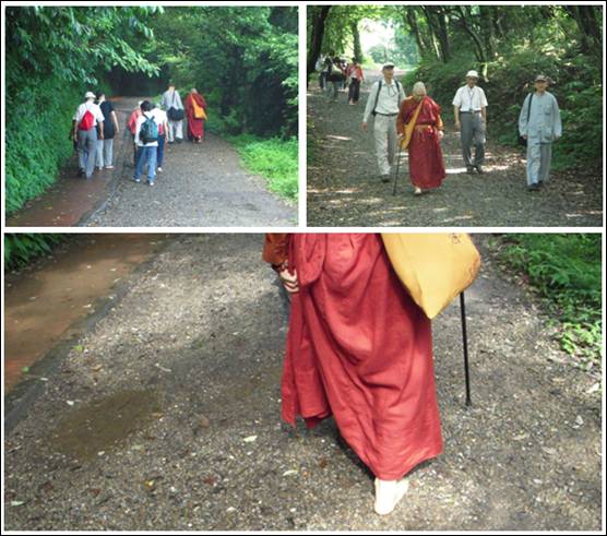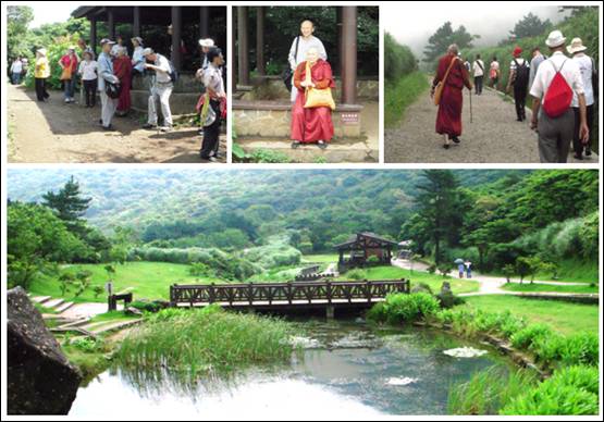 話說某次週五午供的餐後,大伙圍坐閒聊時,師父突發奇想,言及「想要步行環島」一事,希望能帶大家南北走透透。問題是在場者多為上年紀的老人家,與弱不禁風的「奧少年」,所以,先期只好籌劃路程較短的行腳,最好週五當天就能來回。法積師兄便提議,可以去走陽明山的二子坪步道,因為那裡樹蔭清涼、地形平坦,最適合老弱人士「行腳初體驗」,大眾紛表贊同。於是法積師兄便跟班長法心師兄,於隔天週六先去探路,並勘查適宜吃午餐之場所。(同一個週六,也正是阿蝶去南庄探路的日子耶!)