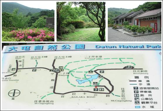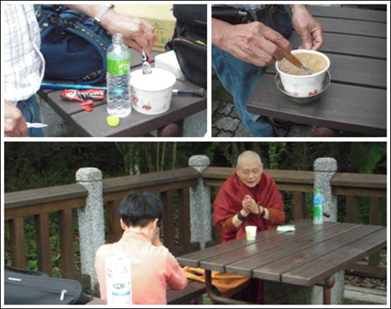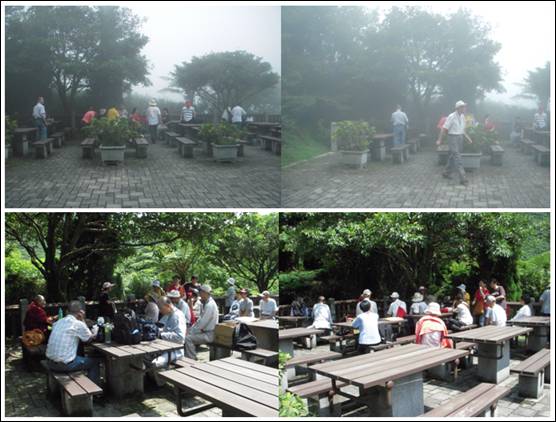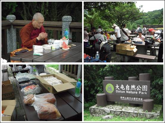 從停車場驅車前往中午用餐處──大屯公園管理處暨遊客中心,其實兩地相隔不遠,驅車只為節省時間,因為師父過午即不食,所以要抓緊時間節奏。本處是法心、法積二位師兄勘查過的最佳用餐場地,四周花木扶疏,屋舍造景古雅,又有現成桌椅與洗手間,夫復何求!其實最早是計畫找家餐廳解決民生問題,而非自己動手做餐點,但沒料到常去的那幾家竟已拆除,這下只好來個戶外大餐!好在非假日,沒什麼遊人,於是理所當然占了樹下幾排位子,準備開動用餐。