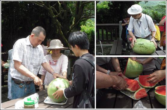 這就是坐在菜籃中搭車上山下野的神秘嘉賓──西瓜。為了保持風味,爾觀師姐行前即囑咐我們,製作一包包的冰塊,於出發前將之墊鋪在瓜兒的四周,再用布包裹,置於菜籃推車中,放進汽車一塊上山下海、等候召喚。此際正宜出場!法心師兄宛如武士,揮起刀柄,俐落縱切,瓜體瞬間被剖兩半,瓜汁瀝瀝、瓤紅皮綠,惹來眾人一陣驚呼讚嘆。姑且送上一首謳歌:「佐餐的嘉果、驕陽的神侶、解渴的聖品,就是您──傾城傾國、美艷無雙的西瓜啊!」行旅山巔水湄而滿頭大汗、燥渴難耐時,吸吮西瓜的甜汁,就是飲下安定靈魂的甘泉。