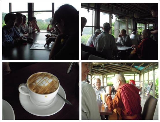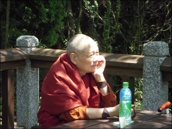 忽有三兩遊人到來,選了座位棲身,正巧落座在樹下Bhante的對面,我們眾人你看我、我看你,正感突兀之際,倒是Bhante一派悠閑自在,隨意與對方聊了起來,氣氛乃重新熱絡,大夥用完餐精神正好,也開始有問題請教Bhante,也談起下週六(5月29日)就要去永和山水庫作法會的事。阿蝶沒閒著,認真東拍西照,也捕捉到Bhante專注的神韻──眼神銳利、唇角上揚,慈祥和藹又莊嚴睿智。午后春陽輕巧停駐在師父額上、眉梢,暈染出一股寧靜亮眼的色調。一襲紅色袈裟,恰與背後墨綠色的樹藤、靛灰色的石柱、棕褐色的欄杆,相映成趣。氛圍如是恬靜,鏡頭喝令光陰瞬間凝結。