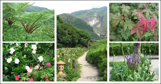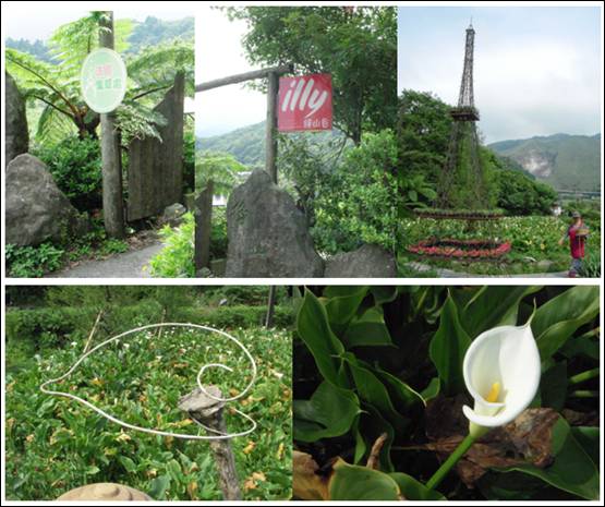 時間尚早,眾人提議再去別處走走。法積師兄推薦位於頂湖的綠山谷海芋園,據說該處視野良好,店主又擅長沖煮美味咖啡。二話不說,上路!九拐十八彎後,終於到了。進園前,門上有著「法國集章處」(跟某海芋季活動有關)的標示,以及義大利illy咖啡的名牌。資料上說:「綠山谷海芋園以海芋及各式花草打造一座法國巴黎鐵塔,夜晚還會閃閃發光,讓評審為之驚豔,最後以『配色佳、手工細緻』奪下冠軍。」果真,鐵塔還在,只是白天看來比較樸素些,襯著遠方冒著白煙的小油坑,有股說不上來的奇異風情。海芋園中,觸目皆是欣欣向榮的海芋(馬蹄蓮),白色佛焰苞片裹覆淺黃色肉穗花序,丰姿甚是素潔高雅。