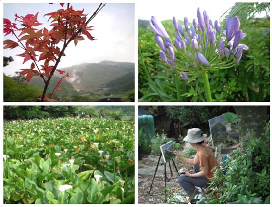 「小油坑位於七星山的西北麓,由陽金公路的小觀音站右轉可達觀景步道,海拔約805公尺,具有後火山作用所形成之噴氣孔、硫磺結晶、溫泉及壯觀的崩塌地形。」遠遠觀之,山景詭譎,恍如被怪手(挖土機)剜掉顱面?從海芋園這端望去,當中橫亙一叢淒紅如血的槭葉,格外予人滄桑之感。樹下有幾支競自搶著出人頭地的艷紫色花苞,不知其名,被眾姐妹相中,買下欲帶回道場供佛。爾強師姐當週正好負責道場的花藝布置,所以也挑了幾把生意盎然、線條優雅的海芋,當成此回插花的素材。再轉至園區另一隅,有三人正畫著圖,嗯,此地近景秀麗、遠景壯麗,確實適合寫生。美景無敵、晴空萬歲!