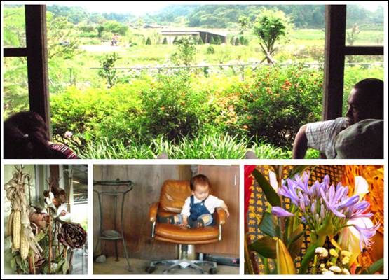 阿蝶踅了好多圈回來,眾人仍在開講,果真是「山中無甲子,寒盡不知年」。既然時間還有餘裕,阿蝶遂又拍起室內百態。屋角有個果盆盛裝新鮮楊桃、鳳梨,等待出售;櫃前皮椅上坐個娃兒自己玩耍中;窗櫺則把大片綠野與纍纍的紅色漿果,框成一幅鄉土水彩畫;牆面披立著乾燥的玉米和塑膠花作為裝飾,熱鬧古怪。洗手間以復古懷舊的風格,打造乾淨清爽的私密空間。最後,壺空杯亦空,該返家囉!趕緊回道場把鮮活的植物,插入大佛像旁的花瓶內,以其清麗迷人的丰姿,供養佛、供養法、供養僧、供養一切眾生……。