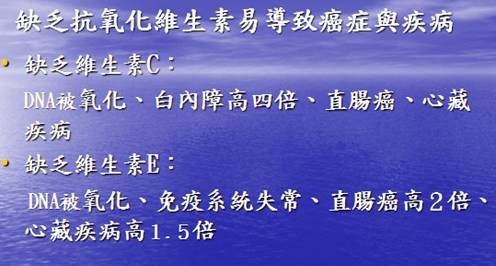 若是缺乏微量礦物質缺乏易導致DNA破損,如鐵、鋅、硒等生化過程中與氧化物有關的礦物質,Ames,1999報告,美國人有7%人口缺乏帖鐵,18%缺乏鋅。下表是巨微量礦物質對於身體的主要功能表,提供各位參考。