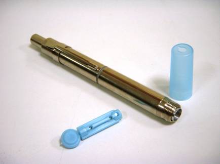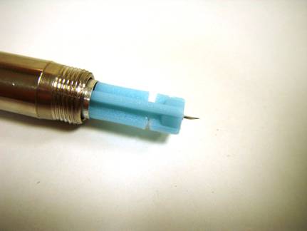 (1) 就要用市面上購買現有的放血產品,此產品組成共有三段,第一段像一隻鋼筆,頭頂可壓入。第二段是刺針,刺針一般有一個保護塑膠頭套著,把塑膠套擰掉,就現出針頭來,然後把此針整隻放入鋼筆底層中間。第三段是一個像筆筒套一樣的東西,尾端中間有一個小洞,當您把鋼筆頭端猛速往下壓時,針頭就會伸出此洞刺入指尖肉裡,刺的深淺剛好,不深也不淺。唯刺得地方要在指甲邊邊約0.1~0.2公分處最好。