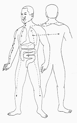 (2)手陽明大腸經部分:由食指內側端之商陽穴,循食指而上,經二、三間穴,至兩骨間之出合谷,上兩筋間之陽谿穴,循手臂而上至偏歷、手三里穴,入肘外廉之曲池穴,上臑外前至臂臑穴,上肩至肩