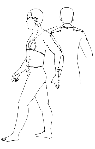 (1)手少陽三焦經部分:起自小指、次指外側端處關衝穴,從關衝上第四、五指之間液門穴、中渚穴,循手腕表上行至陽池穴,出臂外兩骨之間外關、支溝、會宗、三陽絡、四瀆、天井等穴,上貫肘入清冷淵穴,從清冷淵循臂