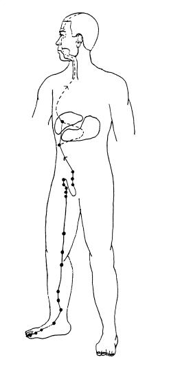 起自足大趾末節甲根後叢毛中之大敦穴(井穴),由大趾、次趾岐骨縫間動脈應手陷中為行間穴(療穴),再上行至第二蹠骨前凹陷中之太衝穴(原穴)。由太衝穴沿足背上至內踝橫前一寸之中封穴(經穴),上行內踝五寸蠡溝穴,再上行二寸為中都穴,上行至犢鼻下二寸旁陷者為膝關穴,上行膝內輔骨下屈膝內側紋頭之曲泉穴(合穴),上行膝上四寸股內廉兩筋間為陰包穴,再上行至股內側足少陰腎經內股鼠蹊氣沖穴下三寸為五里穴,氣沖穴下二寸抵恥骨盡處之陰廉穴(鼠蹊穴),過陰器(又名宗筋)至厥陰之大絡、睪之系為急脈穴,由腹部斜外上行,至第十一肋骨與腋中線處(腹外側凹陷處)之章門穴(臟會穴、脾功穴),由章門穴再斜內中上行至乳下一寸半(七、八肋間)之期門穴(肝功穴)。