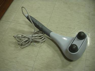 按摩器要買雙球的,機器抓力要大但振動頻率不要太高。若是要對治某穴道不通而疼痛時,就用單球的來振動局部,雙球可以用單邊就成為單球,所以買時還是要買雙球的,因手腳各側面(四面)都要做,就一定要用到雙球的。下圖是一早期美製的廠牌,其抓力大,振動頻率小,很適合各部位按摩(包括頭部),可惜此種廠牌這種樣式已停產了,其缺點是雙球頭橡膠套易破裂。臺灣應也可以買到單球、雙球產品,只是樣式及功能會不一樣而已。