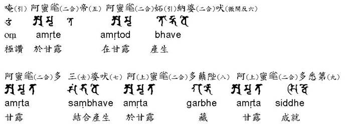 次結無量壽如來根本印,二手外相叉,作拳竪二中指頭相跓,如蓮華葉形,結成印已。誦無量壽如來陀羅尼七遍,以印於頂上散,無量壽如來根本陀羅尼曰