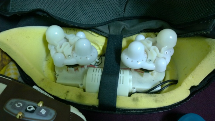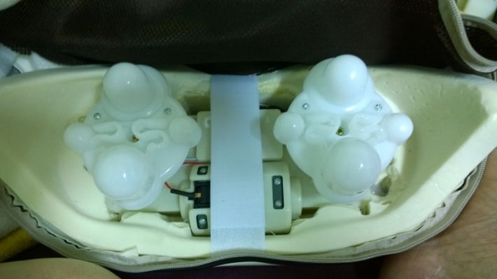再來是通胃部的技巧,把按摩器用雙腳夾住,按摩大腿內側、小腿內側,再按大腿外側、小腿外側,最後單腳把腳板慢慢伸入中間去按摩腳板的左右側,很痛時要穿襪子,也要忍耐點,但不能讓腳受傷。在做大小腿內外側時,就可以使胃反嘔,或是打嗝,胃部通後,頭部脹氣就可以下降。