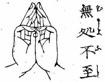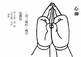 若依《佛頂尊勝陀羅尼念誦儀軌法》─印應為「二手合掌屈二頭指甲相背,以二大指壓二頭指頭,如彈指勢。」又依《四十帖決》所言:「無所不至印,二風(食指)初節甲頗屈殆合甲也。」及日本望月大辭典所述(長谷寺藏本):「無所不至印,與大日劍印之「開塔印」一樣,「二手虛心合掌(手印的印母之一),屈二食指之中節,橫相拄,以二拇指並壓二食指之上節,二拇指之間稍開如劍形。」依此三資料來源所言觀之,風、空二指要有彈指狀,此印似應屈食指尖一節,讓指甲相對碰,有如十四根本之心印,如下圖一、二圖例。這二圖例是最後印圖,密印結法當從蓮花化印開始,最後始成此印圖,要學密法,當要詳知之。謝謝您的mail。