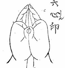 2. 慕陀羅尼印─經云:「屈其頭指以大母指,押合掌,當其心上。」(義淨大師),「作合十指爪印當於心上,二頭指二大拇指各相屈按。」(杜行顗大師),而地婆訶羅三藏所翻無印說明。您說依網上「安樂妙寶」所提的手印,是下列左圖的樣子?有些日本人稱此為「無所不至印」(下左圖),但依佛光大辭典之「無所不至印」似又稍有不同,中指後是交叉如金剛合掌(下右圖),此印又名大惠刀印。