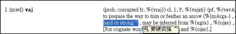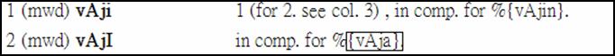 阿質達霰大德Ajitasena,據傳唐開元年間,於安西(即龜茲)譯出《大威力烏樞瑟摩明王經》,經中金剛亦譯為「日囉」,故知「跋枳」不是vajra金剛之譯義。所以「跋枳」似應另有所指。在《穢跡金剛說神通大滿陀羅尼法術靈要門》本經文中有「跋提河邊」之「跋」字,跋提河全稱是阿恃多伐底河Ajitavatī,譯為無勝,位於中印度拘屍那揭羅國,因釋尊涅槃於此河西岸而著稱。《大唐西域記》卷六稱之為阿恃多伐底河,其下註:「唐言無勝,此世共稱耳。舊雲阿利羅跋提河,訛也。典言謂之屍賴拏伐底河,譯曰有金河。」所以「跋枳」似應是「vaj」或「v2ji」,梵文之v2ji,是由v2ja變化來,是有貴重、堅固之意(詳下圖一)。但若是「跋枳」只是強調貴重、堅固又是多餘的,因所有金剛杵都是要這樣。所以「跋枳」也有可能另有意思,因大全力士神王佛是一化佛,而v4ji其梵文名若為v4ji,讀時成「跋祇」,v4 讀成「跋」,所以v4ji即是「跋枳」,當名詞v4ji是佛教人物中之一名稱(詳下圖三)。所以「跋枳v4ji」,此處ji音轉ki音,故成為「跋枳」,故此杵上應該有化佛的像才較如法。