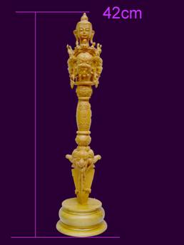 市面上可以請到的所謂普巴金剛杵,其中有一型是九面廿七目(三層),上有一化佛頂,下有三摩竭魚等,詳圖五(52cm)。經請教本師父,他說這是普巴杵中的穢跡金剛杵。依此樣子我們就設計出下列之大權金剛力士「跋枳金剛榼杵」,化佛頂在最上面,次為一層三面之金剛力士,其面若要著色,要三面要各著三色之一色(紅白黑),如此之力士像更佳,代表能去除貪瞋癡三毒。此杵連底座有42公分高,化佛之下是有空間,以便容裝納入胎藏之經咒,藉此機緣示圖供參閱(詳圖六)