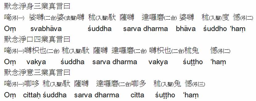 末學佛學淺薄,想請問每個佛教徒普遍在誦經、持咒、修法前,幾乎都會讀誦到的淨身、口、意三業真言的問題: