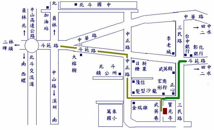 ☆☆在北斗市區下車後,請走至中正路,往南朝鎮公所的方向走,經公所後,會看到一家髮型沙龍,再左轉進入小路,路口有家銀樓,繼續走至宏彬商行前小巷(武英巷),右轉進入即到寶光寺。
