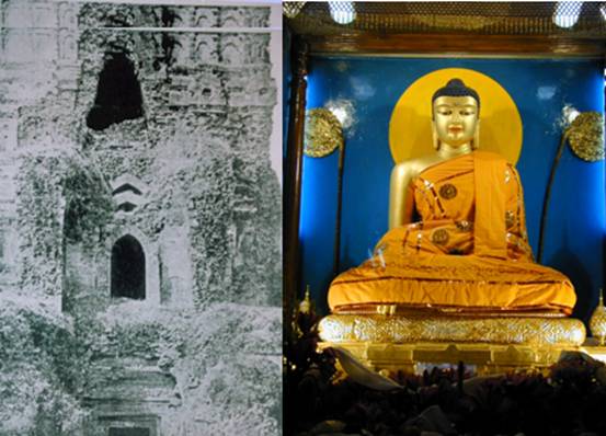 大塔因为避回教徒摧残,遂将大塔掩埋形成一土丘,湮没数百年,直到一八八一年,始由考古学家康林罕 (A. Cunningham) ,这个人他根据文献,认为以前缅甸国王有建造一个大塔在这边,照道理来讲应该在哪一个方向,就开始探测、开始去挖掘,在一八八一年真的把它挖出来,挖出来就是刚刚所看的那张图片,还没清理干净的那张图片,这时候举世震惊,每年去朝圣的佛教徒从此后就非常的多。