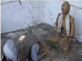 「太子默然而逝,复前念言:『今我入山,当用宝衣为?世间痴人,皆为财所危。』即便见猎师,駈游被法衣。太子喜念言:『此则真人衣,度世慈悲服,猎者何故着?心念欲贸易,成我志所愿。』便持金缕衣,贸所法震越。猎者内欢喜,菩萨亦俱然。太子被震越,柔软鲜且洁,顾视僧伽梨,过佛无差别,于是遂入山。菩萨得法服,欣喜光照耀。山林诸道士,一名为阿兰,二名为迦兰,(Ārāda-kālāma)学来积年,四禅具足,获致五通,见光惊怖,此何瑞应?便共出观,遥见太子:『是为悉达,今果出家。善来悉达便坐是榻,冷泉美果今可食之。』