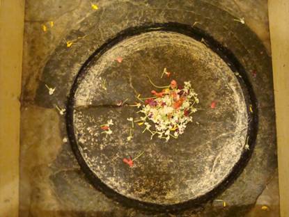 世尊佛像处早晨供养花、油、食物的圆石盘