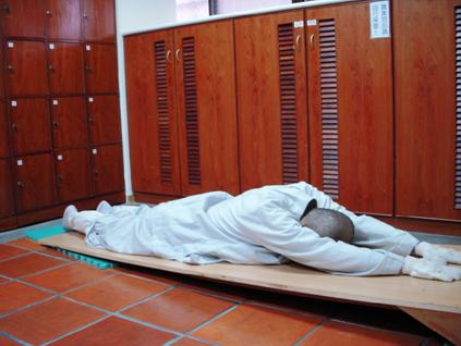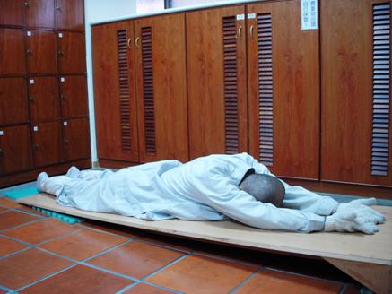 第廿图 力道不足者 臀腰部微突后弯拉起身体收手