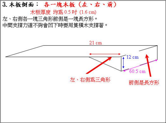 木板制作时要注意前高尾端平着于地面,板面上最好要没有钉孔,以免伤到手指,或刮伤手套。下图可供参阅,这些长、宽、高等数字,都是合乎有利(有字)的数字,可依此制作拜佛的木板。若木板中间不稳固,可再加一横木材垫高,以达到稳固为主。