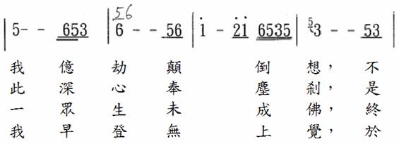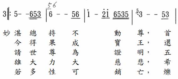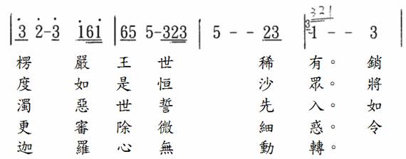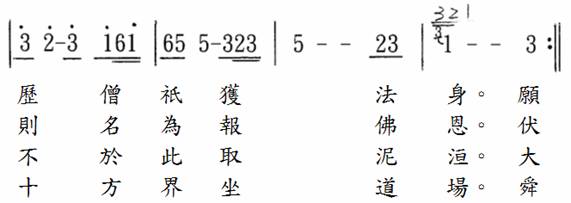 在唱颂当中,因为在乐谱中叩钟的那个字只标示三拍,为了不影响乐曲弦律太过,我们虽然拉长了时间,但是全曲18句9段唱颂时的叩钟都是做钟响5秒,不会让唱颂停顿太久,钟声也不会比佛光山的版本短。