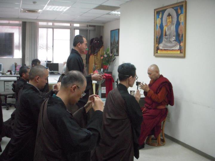 开门后是一条“一线天”一样的过道楼梯,径直上去后师兄师姐们热情迎接。亲爱的杨师兄自我介绍说是师父的侍者,然后跟我交代相关事项。楼上还有佛堂大殿,杨师兄带领我们上去,耐心教我们如何礼佛,如何问讯,如何按照南传方式向师父顶礼等细节,包括后来参加法会如何穿海青搭缦衣等等,很让人感动。说来惭愧,自己平时自修,不喜热闹,不想去参加各种法会,因此对这些仪轨比较无知。感恩师兄师姐和道场的护法菩萨们宽容体谅了。