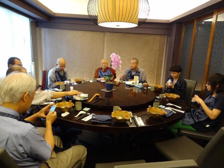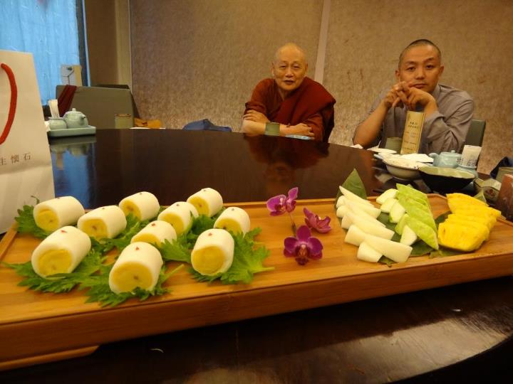 到了现场,哇!就餐环境一流,干净整洁,上来的菜每一道都是精品,我们赶紧拿相机逐一拍摄留念。身处大陆,实在难得吃上如此精致的素斋,别说吃,看到都困难。没想到后来接二连三被请吃饭的,都是一样精美的素菜。我后来跟师兄师姐们一再表示,这次来道场我也被“卡”到了,被道场的美味饭菜和台北的精美素斋给卡到了,肠胃正在经受考验中……。这顿饭我们边吃边聊,一直到店家打烊才离开。与师兄师姐们交流,总有说不完的话题……。