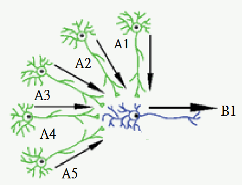 轴突(axon)作为神经细胞的输出通道,可以与一个或多个目标神经元发生连接(下图5对1连结)。一些轴突在运行中发出分支,这些分支称为侧支(Collateral)。来自主枝的动作电位在各个侧支上同时继续传递,最终达到不同的目标。在轴突与目标神经元发生联系的部位,一种称为「突触」的结构实现两个(或有时为多个)神经元之间的通信。