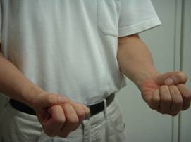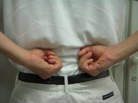 (1) 双手握虚拳,贴在身后肾俞穴处,双拳放肾俞穴处,双拳不动。