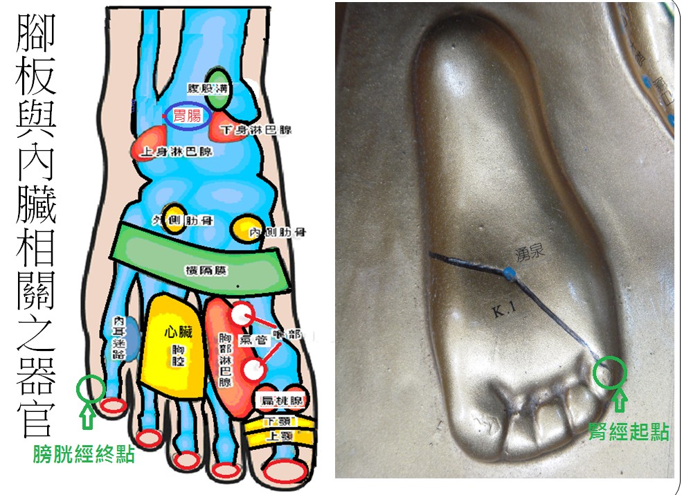 每个人都知道有个简便的健康法是脚底按摩,但大部份人会去花钱找人按摩脚底,又受苦痛,又解决不了真的病痛问题。其实不只脚底,连手掌都与身体五脏六腑有关,中医理论认为,人体的五脏六腑在手脚上都有其相对应的穴位。而脚趾与五脏六腑有关系者,足三阳经脉─(1)足阳明胃经、(2)足少阳胆经、(3)足太阳膀胱经。足三阴脉─(1)足太阴脾经()(2)足厥阴肝经()(3)足少阴肾经()。足三阳、足三阴互为表里,(1)足阳明胃经、足太阴脾经()是一对,(2)足少阳胆经、足厥阴肝经()是一对,(3)足太阳膀胱经、足少阴肾经()是一对。
