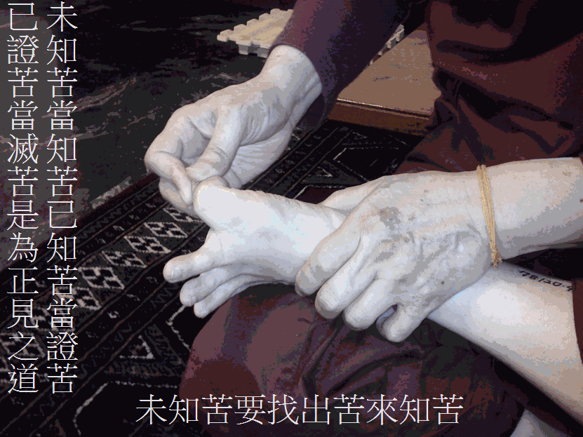 四圣谛法(苦集灭道)中,以苦谛为先,佛陀说:未知苦,当知苦;已知苦,当证苦;已证苦,当断苦。既然五蕴身皆是苦,我们的色身疼痛也是苦,您要去找出苦痛处,去证知苦痛位置与程度;已证到何处痛、如何痛、其痛程度如何,就要来断其苦;一日不断,二日断,二日不断,一周断,一周不断,一月断,…,总之,就是先要灭此苦痛之苦。有这种知见者,就是已学到佛法之苦圣谛、集圣谛、灭圣谛,有这样知见的人,可以说是具正知见。用此理念来修心养性,也是一样得道理也。