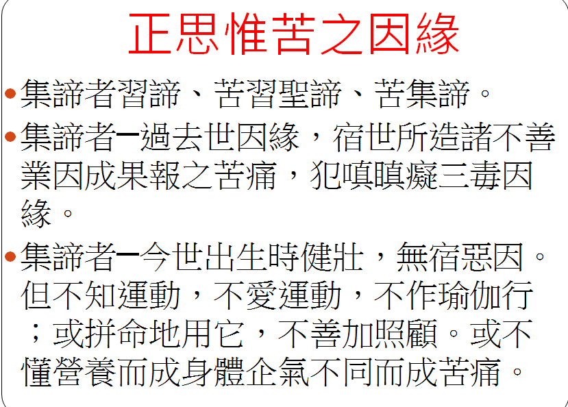 继之,思惟集谛之道理,未知集之因,当知何因之集,造成苦痛之果。已知集因,当证其因集,已知不善保养色身,或好吃美食、厚味之因,造成身体之病痛。已证集因时,当知要断,断此集因,除不再继续造业外,还要灭其因与所现之果,不除脚趾头痛,就不能灭其苦,身体不能得到健康,所以要好好体会此道理,处理此脚趾头之疼痛。