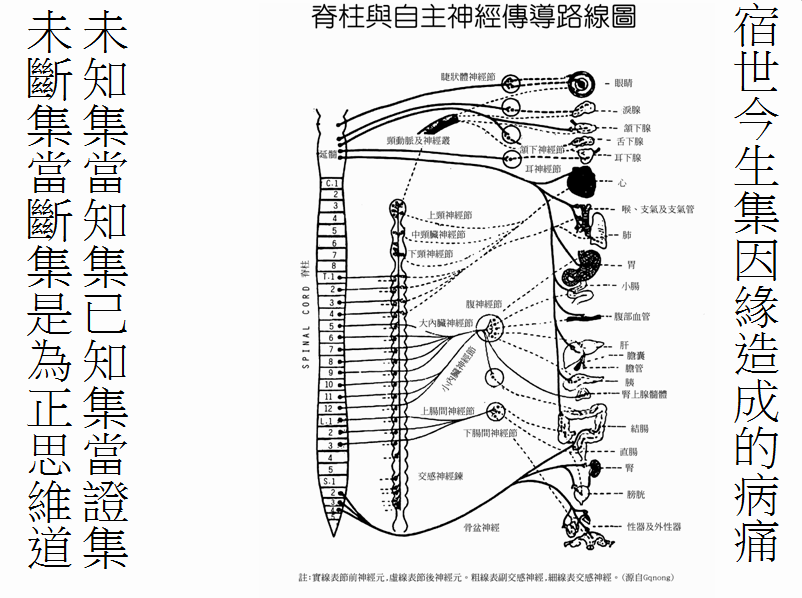 现今身肢疼痛用八支法:(1)(2)(3)(4)(5)(6)(7)(8)扳压等,要有智慧利用此八法,互相以二、三、四法并用之。若是都不痛应是仙人、圣人,不要自我认定脚趾已不痛。试试不同角度、弯度、折度、压力、扯力、拉力、捏力等等够不够大,若不够大就会说已不痛。除此外,根本上还要断语业四(妄语、两舌、恶口、绮语)、身业三(杀、盗、淫)等,前者为正语道,后者为正业道。如此才能断宿世恶集之因缘,也断今世之苦与未来世之苦源。