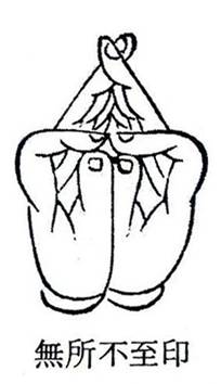 若依《佛顶尊胜陀罗尼念诵仪轨法》─印应为「二手合掌屈二头指甲相背,以二大指压二头指头,如弹指势。」又依《四十帖决》所言:「无所不至印,二风(食指)初节甲颇屈殆合甲也。」及日本望月大辞典所述(长谷寺藏本):「无所不至印,与大日剑印之「开塔印」一样,「二手虚心合掌(手印的印母之一),屈二食指之中节,横相拄,以二拇指并压二食指之上节,二拇指之间稍开如剑形。」依此三资料来源所言观之,风、空二指要有弹指状,此印似应屈食指尖一节,让指甲相对碰,有如十四根本之心印,如下图一、二图例。这二图例是最后印图,密印结法当从莲花化印开始,最后始成此印图,要学密法,当要详知之。谢谢您的mail。