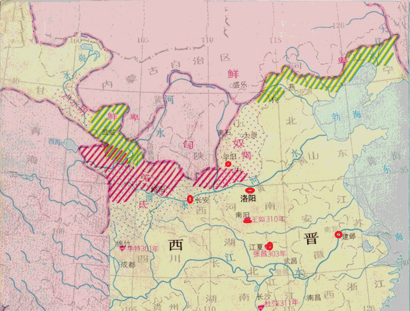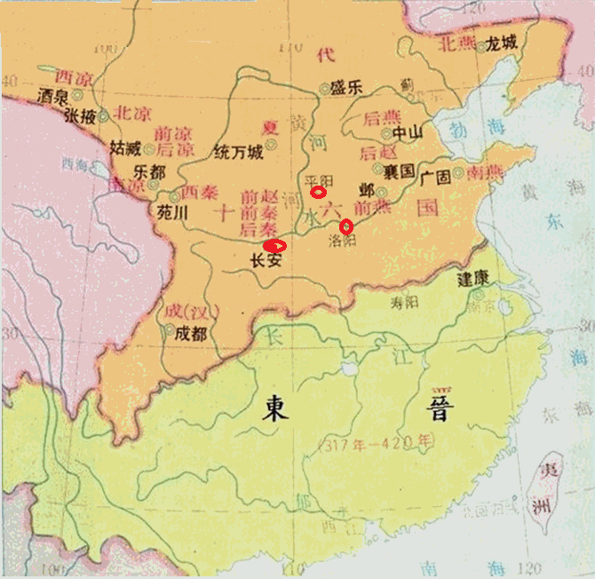 前述五胡乱华是由304年冬天开始,氐族领袖李雄占领成都,自称「成都王」,史称成汉;永嘉二年(308)十月,匈奴贵族刘渊起兵于离石(今山西离石),刘渊称皇帝,国号汉,改元永凤,史称汉赵,此是五胡建国的开始。